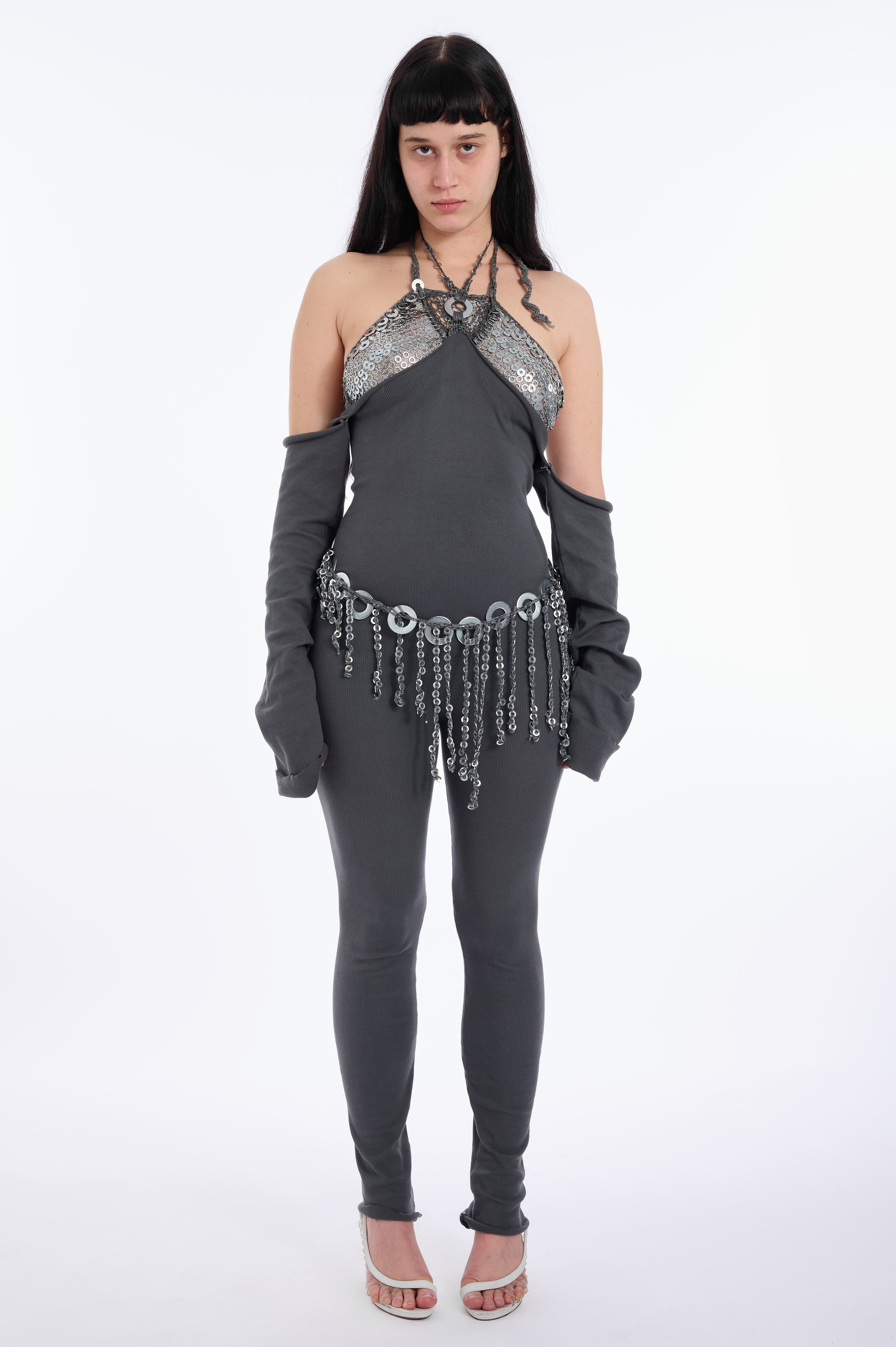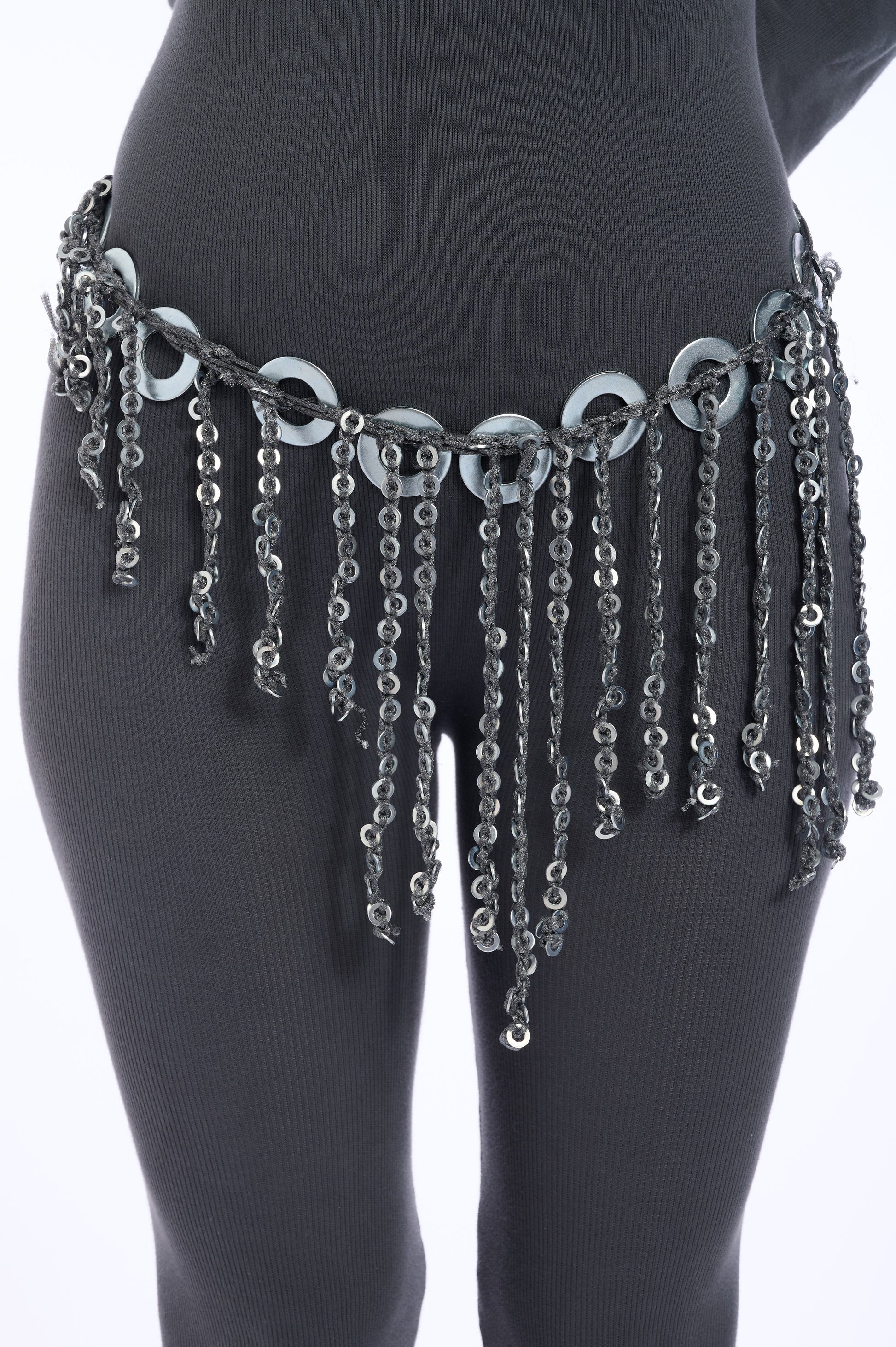 The Mithril 02 Belt is designed to accentuate the waist. Entirely handcrafted, it features a metal snap closure and an assembly of stainless steel washers, interconnected with Lurex yarn woven into organza. The piece highlights a refined balance between artisanal craftsmanship and industrial-inspired materials.
