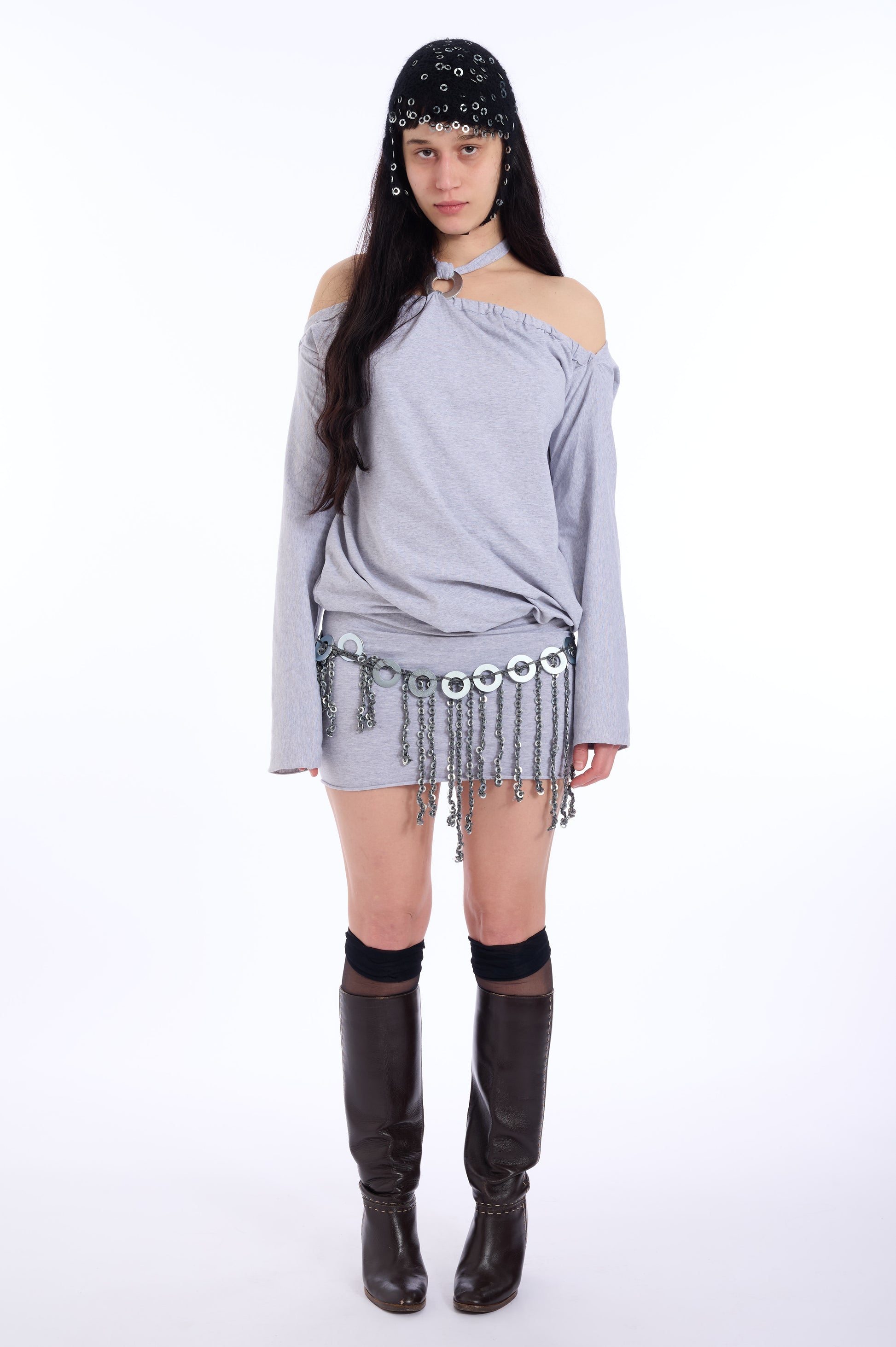Crafted using a knitting machine and finished by hand, it features a stainless steel element individually hand-sewn onto the garment.