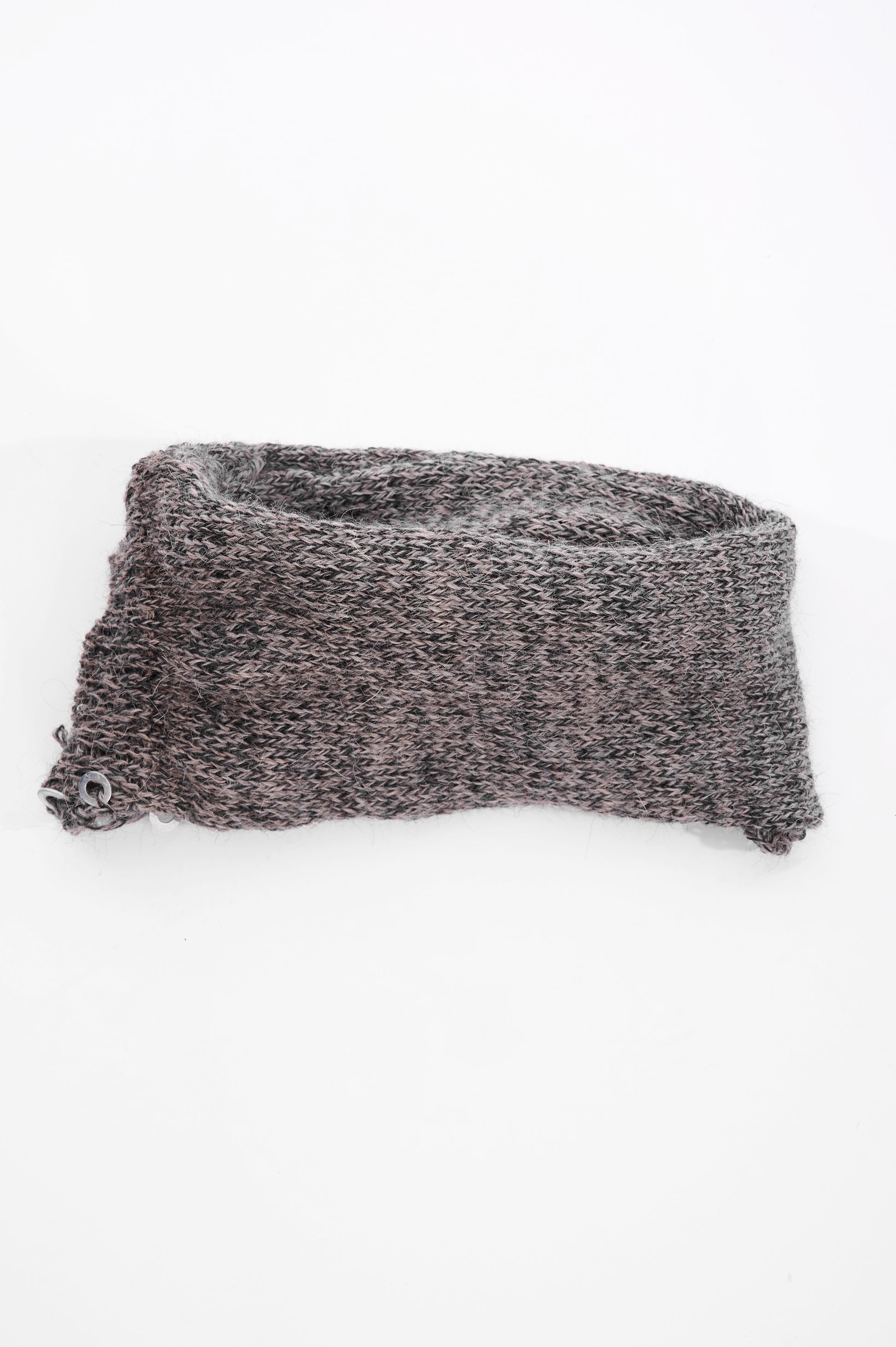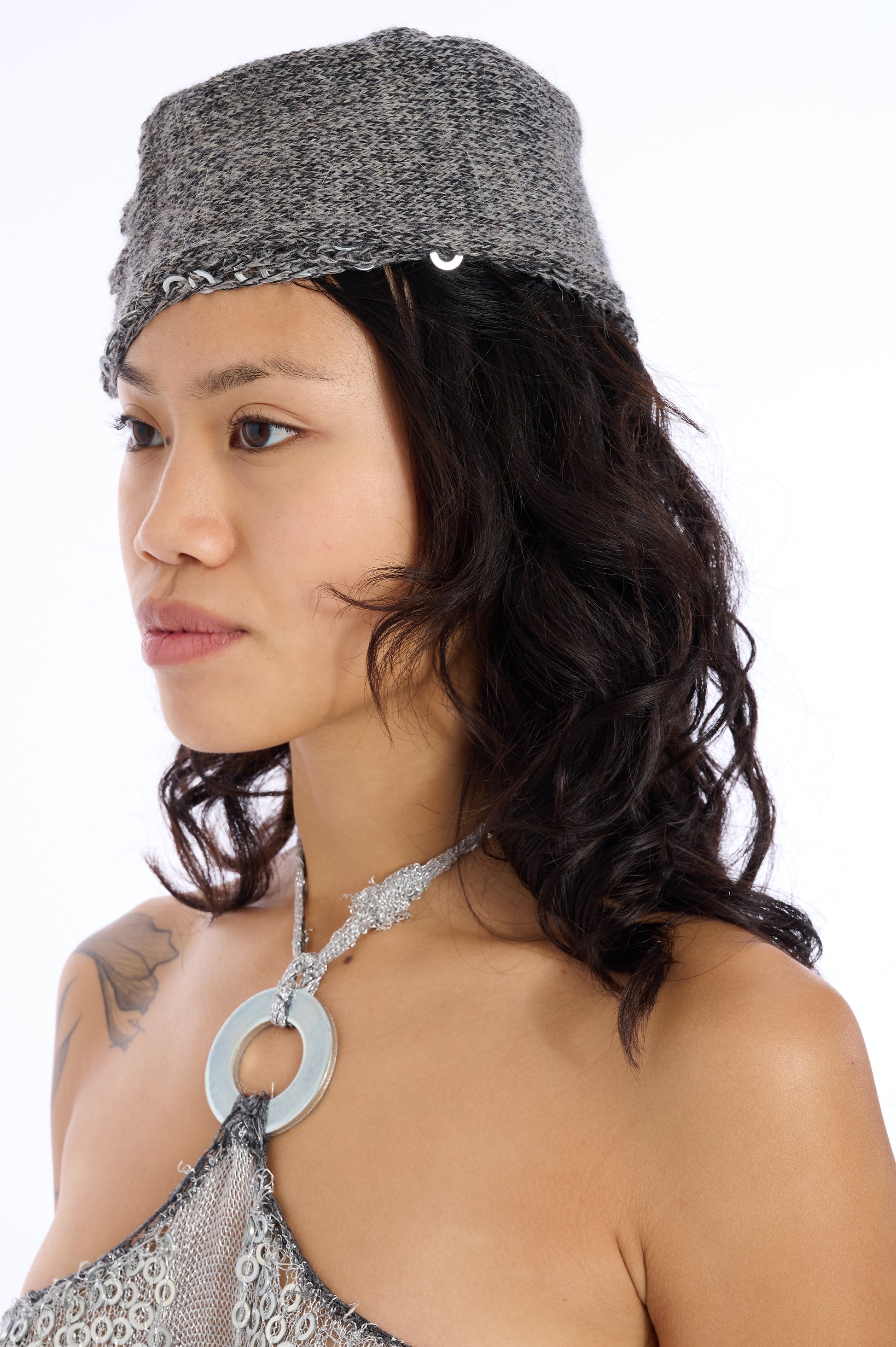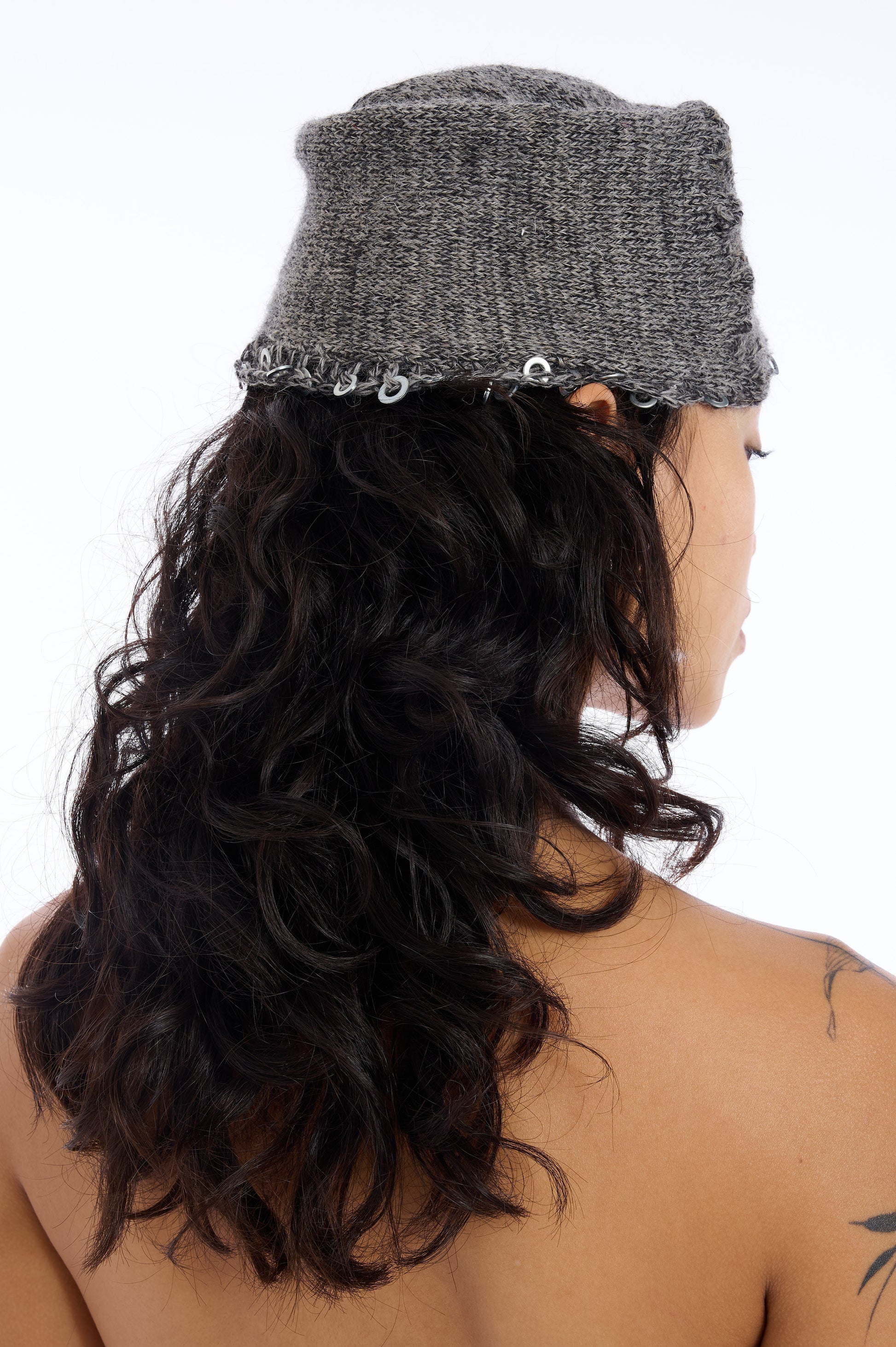 The Hat Valentina is entirely handcrafted using a domestic knitting machine and finished by hand. Stainless steel rings are applied as side details, adding a subtle industrial contrast to the softness of the mohair yarn.